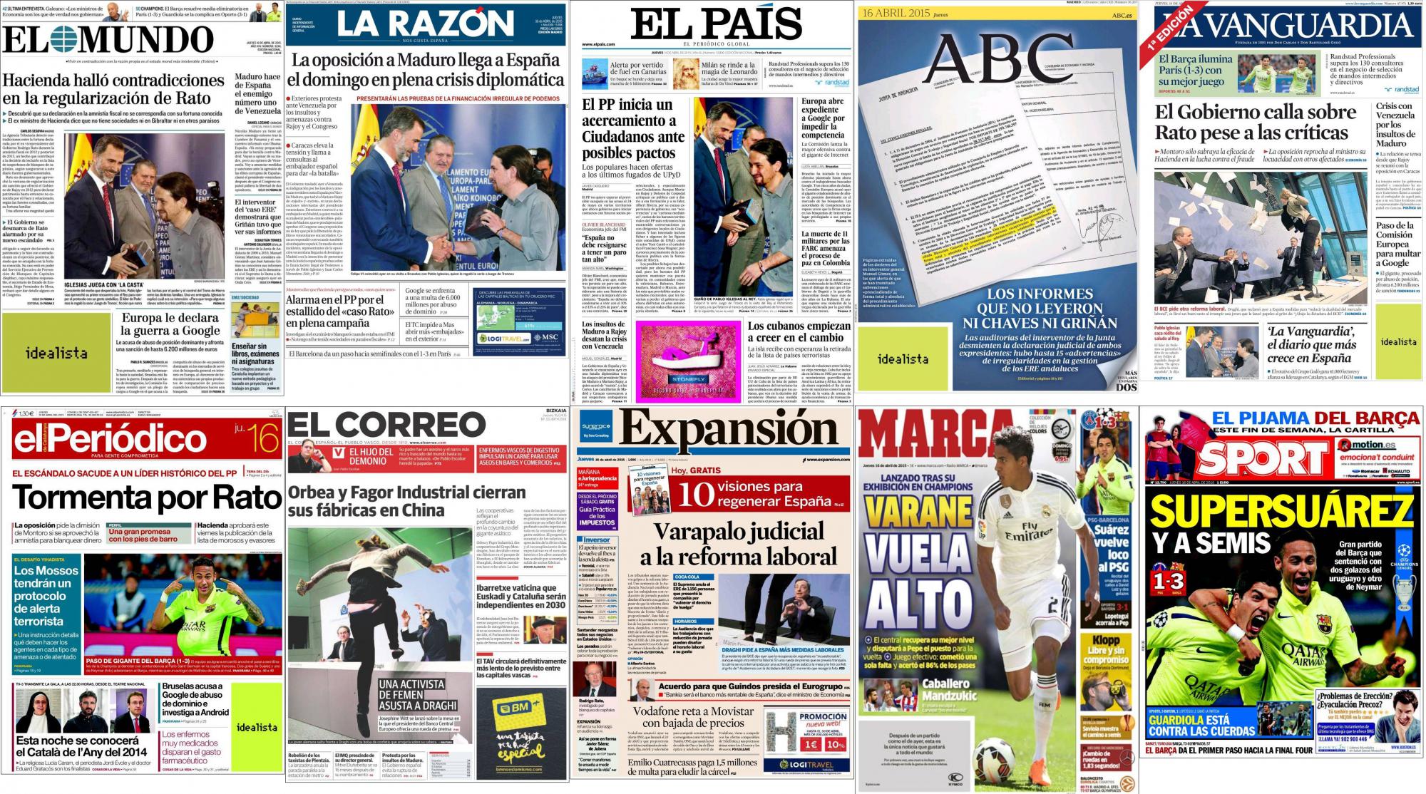 El Mundo dice que “Hacienda halló contradicción en la regularización de regularización de Rato”. Amplia con que “descubrió que su declaración en la amnistía fiscal no se correspondía con su fortuna conocida”, mientras que el ministro de Hacienda afirma que no tiene sociedades ni en Gibraltar ni en otros paraísos fiscales. En la misma información, “el Gobierno se desmarca de Rato alarmado por su nuevo escándalo. En la foto, el Rey y Pablo Iglesias, después de que el dirigente de Podemos regalara la serie “Juego de Tronos” al Monarca. El diario también se ocupa los siguientes asuntos: “Europa le declara la guerra a Google; le acusa de abuso de posición dominante y afronta una sanción de hasta 6.200 millones de euros”; “Maduro hace de España el enemigo número uno de Venezuela”; y “El interventor del ‘caso ERE’ demostrará que Griñán tuvo que ver sus informes”.