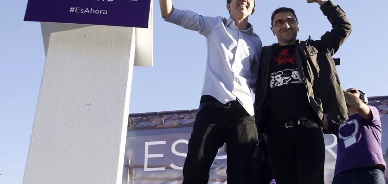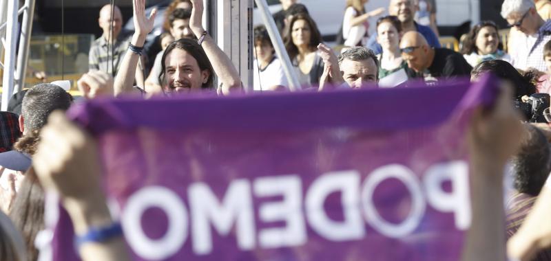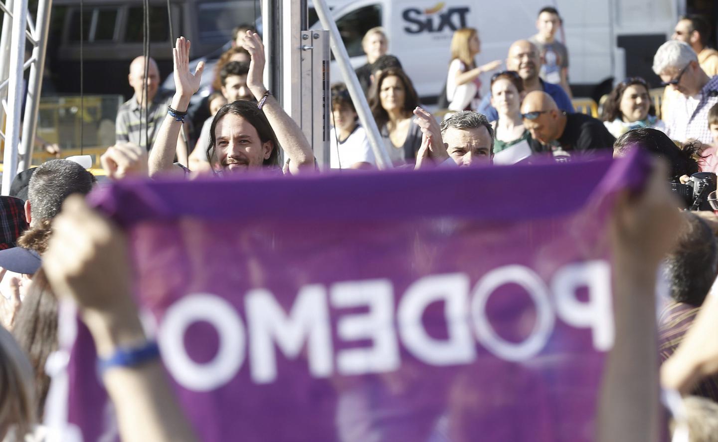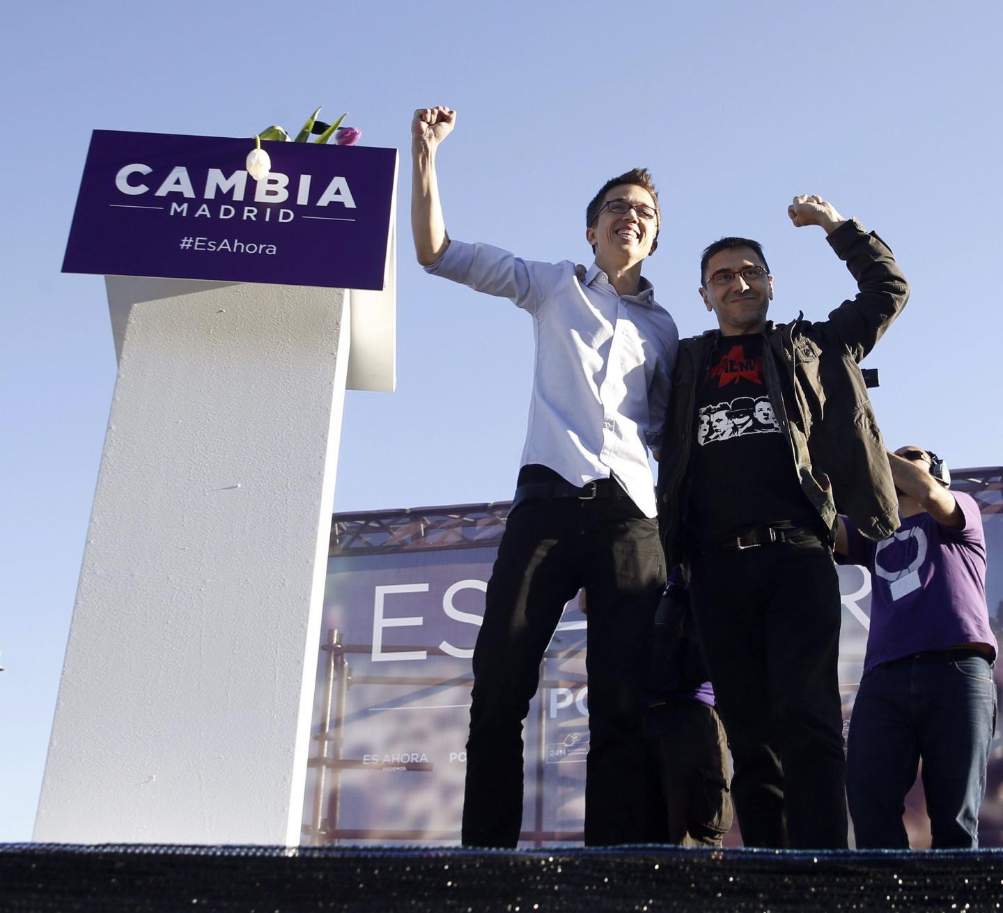 Juan Carlos Monedero ha subido al escenario (fue de público) en el cierre de campaña junto a Iñigo Errejón. Efe