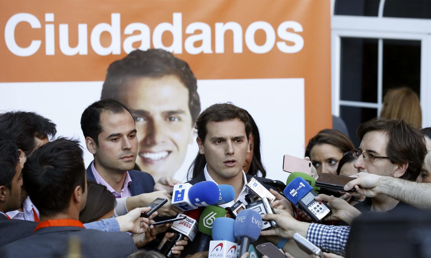 Albert Rivera, con sus candidatos en Madrid en la víspera de la jornada de reflexión. Efe