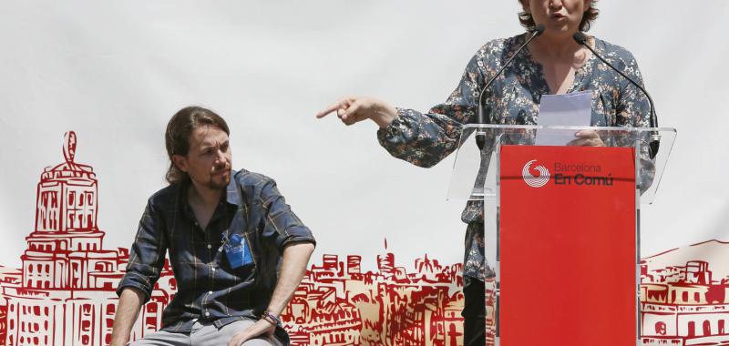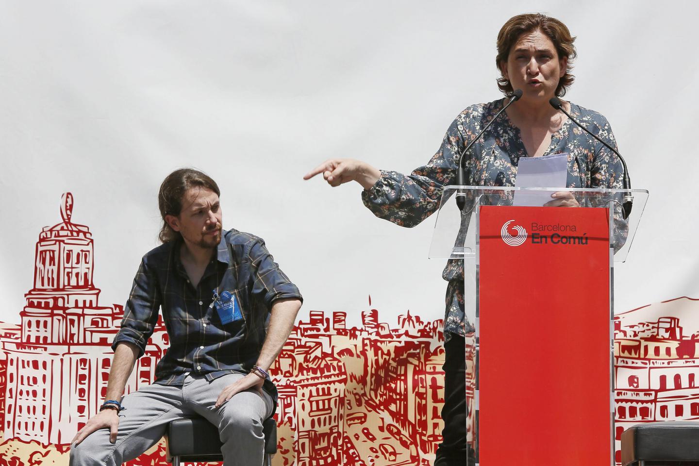 Ada Colau (Barcelona en Comú), arropada por Pablo Iglesias en un mitin en Barcelona. Efe
