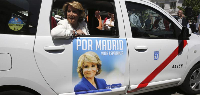 Esperanza Aguirre se promociona en algunos taxis de Madrid, que llevan su imagen en el exterior y folletos en el interior. El primer día de campaña no dudó en subir en uno. Efe