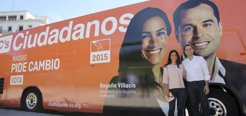Begoña Villacís e Ignacio Aguado, candidatos de Ciudadanos a la Alcaldía y a la Comunidad de Madrid, respectivamente, el día del estreno de su autobús. Efe