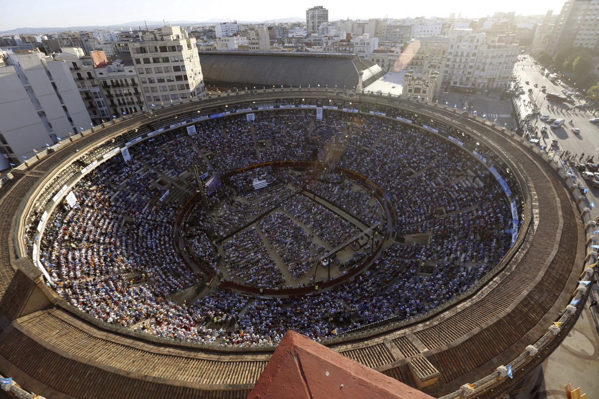 | La plaza de toros de Valencia, abarrotada para asistir al mitin del presidente. Efe |