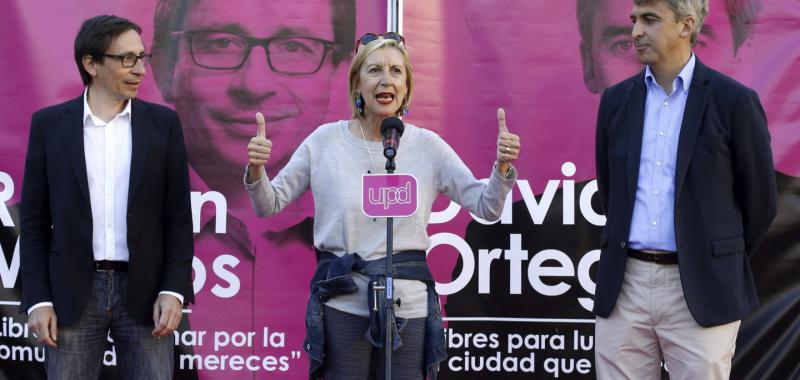 Rosa Díez, en la plaza de Isabel II de Madrid, con Ramón Marcos y David Ortega ya instado a sus candidatos a ser “condenadamente optimistas” y a “no rendirse nunca” en la lucha por la “limpieza” y la regeneración democrática. El equipo de UPyD, ha defendido, está hecho de "gente valiente, gente justa y gente libre". Unas 200 personas han acudido a escuchar a Díez, entre ellos Andrés Herzog o Carlos Martínez Gorriarán, en una ciudad y una Comunidad, Madrid, en la que se lo juegan casi todo.