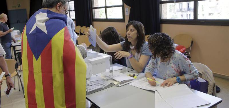 • Un ciudadano ataviado con una bandera independentista vota esta mañana en un colegio electoral del barrio de Sagrada Familia de Barcelona.