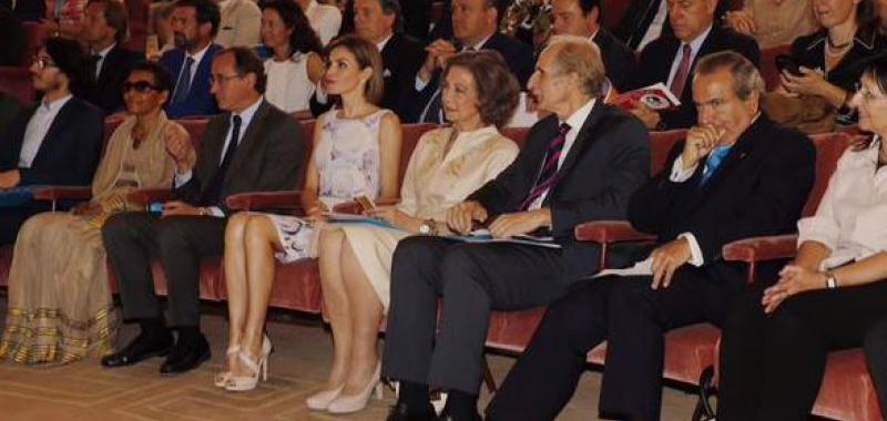 Desde la primera fila del auditorio le escuchaba la Reina Sofía, con la que ha intercambiado besos y gestos de cariño en varios momentos del acto, tanto cuando le ha entregado el premio como al coincidir cuando han subido y bajado del escenario.