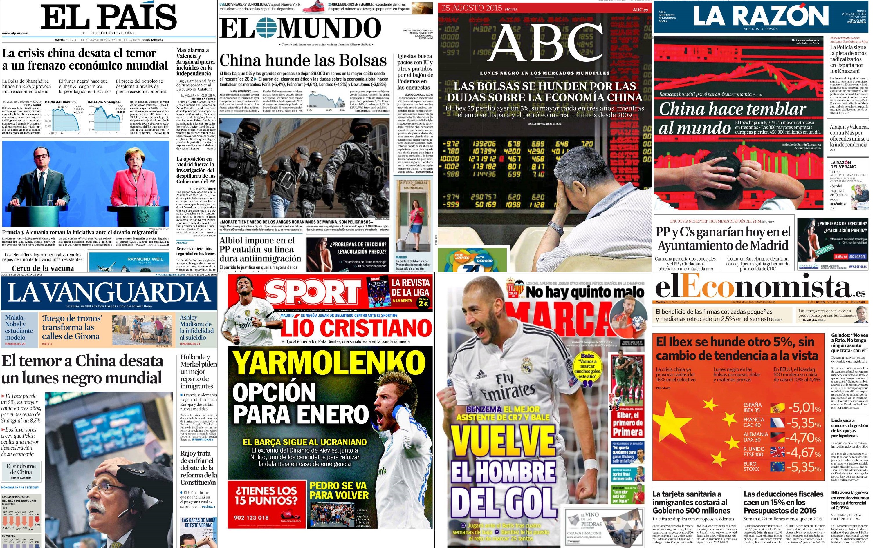 ABC: “Las Bolsas se hunden por las dudas sobre la economía china”. Habla de ‘lunes negro’ en los mercados mundiales, mientras el Ibex 35 perdió un 5%, “el euro se dispara y el petróleo marca mínimos desde 2009”.