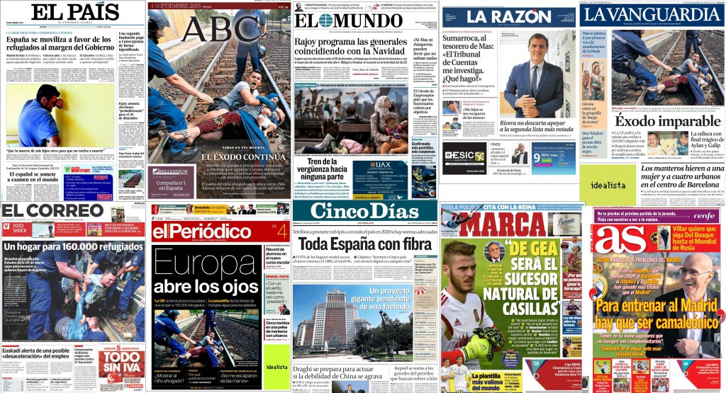 El Mundo también usa la crisis migratoria para ilustrar su portada, aunque en este caso utiliza la imagen de una familia en la estación de Budapest. Aunque abriendo se sitúa la posibilidad del 20 de diciembre como fecha para las elecciones generales con un "Rajoy programa las generales coincidiendo con la Navidad".