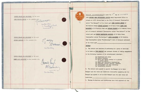 Días antes de publicar su primer sencillo, Love Me Do, los cuatro integrantes definitivos del grupo -John Lennon, Paul McCartney, George Harrison y Ringo Starr-, rubricaron el único documento que les uniría a Epstein, que controló los pormenores del despegue de su carrera.