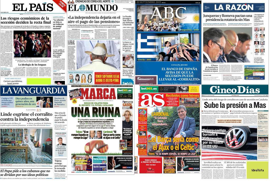 A cinco días del 27S, Cataluña es la protagonista de todas las portadas. Si la mayoría destacan los efectos negativos que traería una eventual independencia, que este lunes resaltaron desde el sector empresarial y el bancario, La Razón continúa desgranando el culebrón interno de la principal candidatura independentista, Juntos Por El Sí, dejando a Artur Mas en la peor situación posible. La cuestión catalana salta también a la prensa deportiva. Tanto Marca como As recogen las declaraciones del presidente del Consejo Superior de Deportes, Miguel Cardenal, y del presidente de La Liga, Javier Tebas. El primero advierte de que "El Barça sería como el Ajax o el Celtic", mientras que Tebas asegura que "si se rompe España, se rompe la Liga".