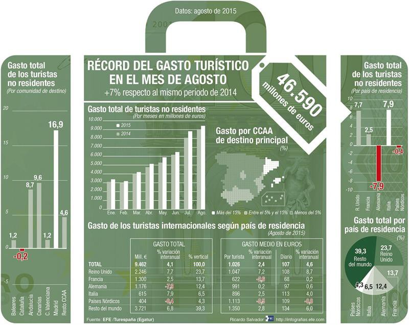 nuevo récord, con 9.462 millones de euros, un 4,1 % más, impulsado por el repunte del gasto medio por persona, del 2,4 % y del diario, del 4,6 %.