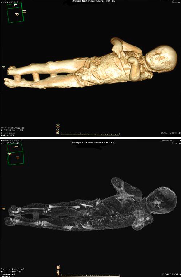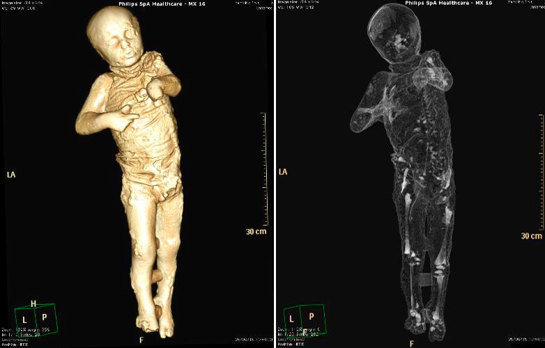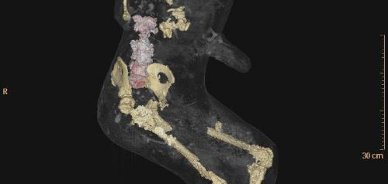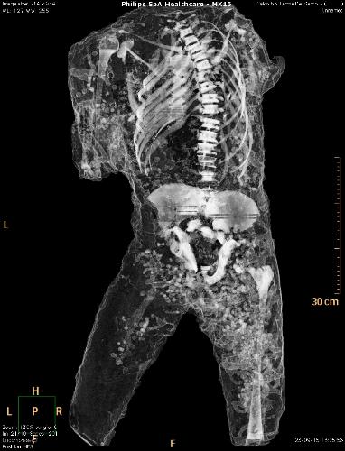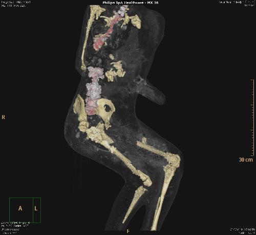 El objetivo del estudio radiológico ha sido obtener imágenes del interior de los cuerpos que quedaron conservados en ceniza durante la erupción del volcán, y que luego fueron rellenados con yeso con el propósito de preservar su integridad.