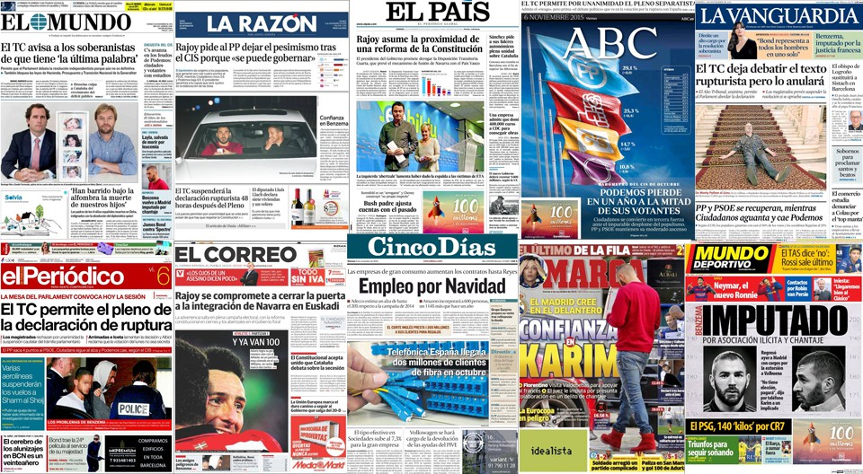 El CIS y Cataluña se reparten los titulares de este viernes. Sobre la encuesta, Podemos y Ciudadanos centran la atención del análisis en el día después, a pesar de que son PP y PSOE quienes encabezan los sondeos: Ciudadanos se hace fuerte, en buena medida gracias al hundimiento de Podemos, cuyos votantes se están plenteando coger la papeleta naranja, según la lectura de El Mundo. Las opiniones y editoriales analizan la decisión del Tribunal Constitucional sobre permitir el pleno independentista del próximo lunes a pesar de avisar de la ilegalidad del texto que Juntos por el Sí y la CUP pretenden votar. Y donde el jueves había instancias a los magistrados para que prohibieran la celebración de la votación el 9N, hoy hay vítores a la "prudencia" e "inteligencia" del alto tribunal ante tan delicado asunto; una de cal y una de arena.