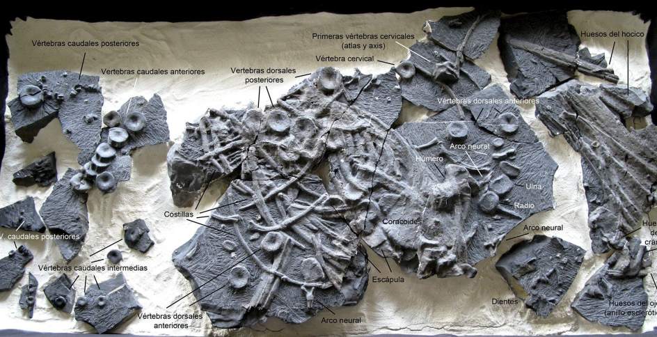 En él pueden apreciarse 60 vértebras, de las cuales 35 corresponden a la zona comprendida entre el cráneo y la base de la aleta caudal; 55 dientes dispersos cónicos y puntiagudos, algunos huesos de la parte inferior y posterior del cráneo, la clavícula, el coracoides y posiblemente la escápula.
