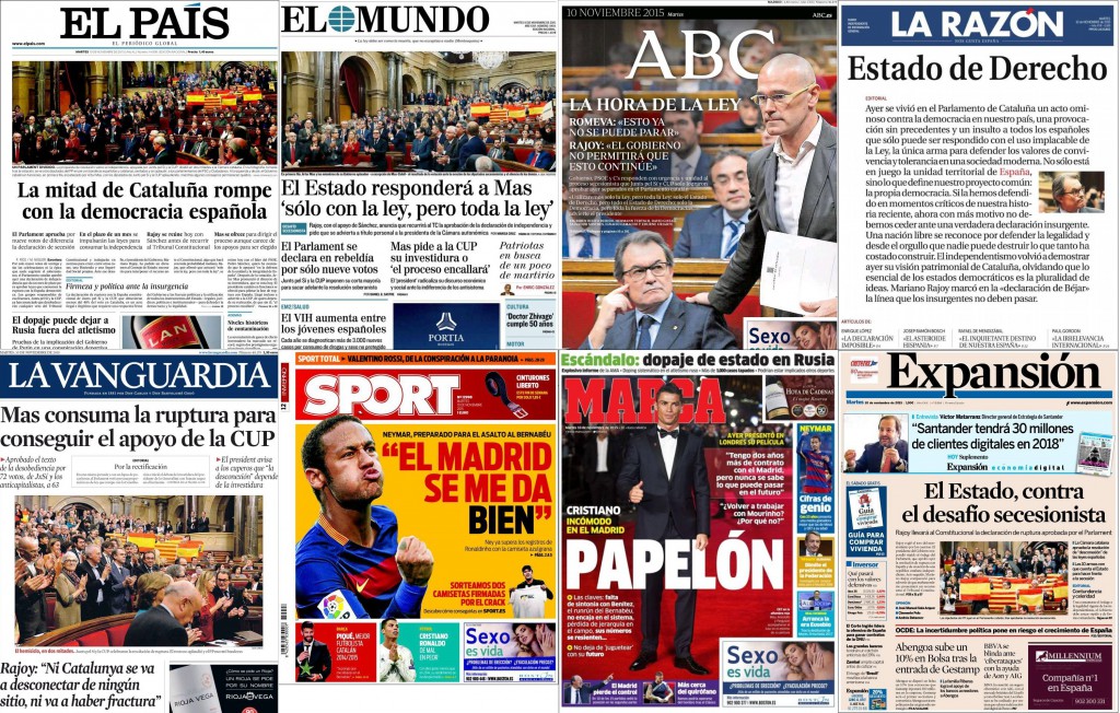 Para El País, la foto del día es la de "un Parlament dividido": unos (PP), mostrando banderas de España y Cataluña; otros (PSC y Ciudadanos), sentados y sin aplaudir; un tercer grupo (el del Gobierno en funciones), eufóricos; los últimos, quietos, como si no supieran lo que toca. "La mitad de Cataluña rompe con la democracia Española", expresa el periódico. En el editorial destacado en portada, se mira al día después: "Firmeza y política ante la insurgencia". Aunque poco, hay espacio para otros asuntos, como que "el dopaje puede dejar a Rusia fuera del atletismo" después de que se hayan encontrado "pruebas de la implicación del Gobierno de Putin en una conspiración deportiva".