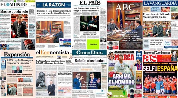 De nuevo Cataluña manda en las ediciones de los principales periódicos nacionales. En este caso se narra la caída en desgracia de Artur Mas y la respuesta del Estado al desafío secesionista. Pero parece que la política de la amenaza está aquí para quedarse. Ahora es el primer ministro británico, David Cameron, el que dice que Reino Unido se va sino se cumplen con sus exigencias.