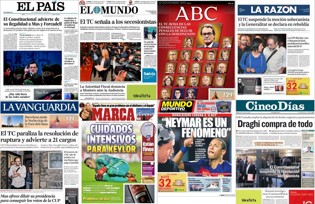 El País titula así: “El Constitucional advierte de su ilegalidad a Mas y Forcadell”, aunque “la Generalitat promete seguir adelante a pesar de la suspensión de la declaración”. EN la foto, Mariano Rajoy junto a periodistas, tras su declaración institucional. Además, La alianza de izquierdas, a punto de llegar al Gobierno en Portugal”; y unas declaraciones del comisario de Inmigración de la UE: “El sueño europeo se desvanece”.