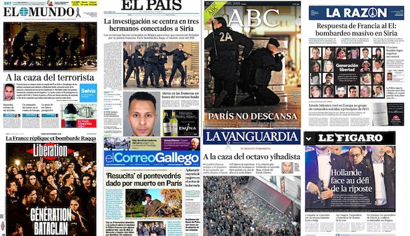 El País: “La investigación se centra en tres hermanos conectados a Siria”. Además dice que los terroristas fueron reclutados en Bélgica para evitar que estuvieran fichados por la policía francesa, y que París bombardea Raqa, el bastión sirio del ISIS. Con foto del sospechoso, también se informa de la “Alerta en las fronteras en busca del terrorista huido”.