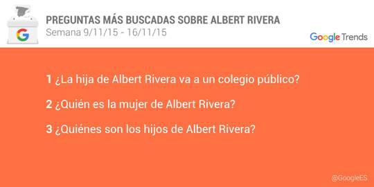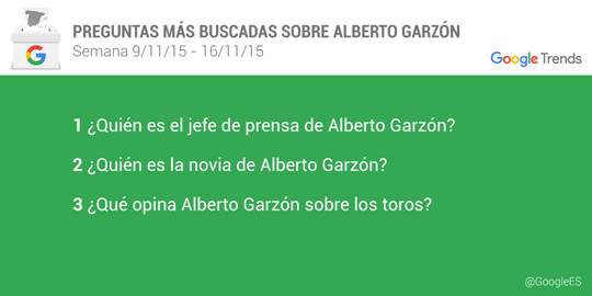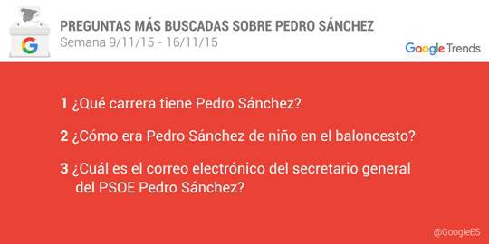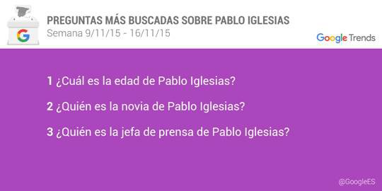 Google ha desvelado cuáles son las preguntas que más se formulan los españoles sobre los candidatos a presidente del Gobierno. El líder de Podemos, Pablo Iglesias, acapara la mayor cantidad de búsquedas - un 38 por ciento - seguido por el jefe del Ejecutivo, Mariano Rajoy - un 27 por ciento -, el líder de Ciudadanos, Albert Rivera - un 21 por ciento -, el del PSOE, Pedro Sánchez - un 10 por ciento - y el candidato de Izquierda Unida, Alberto Garzón - un 3 por ciento -.