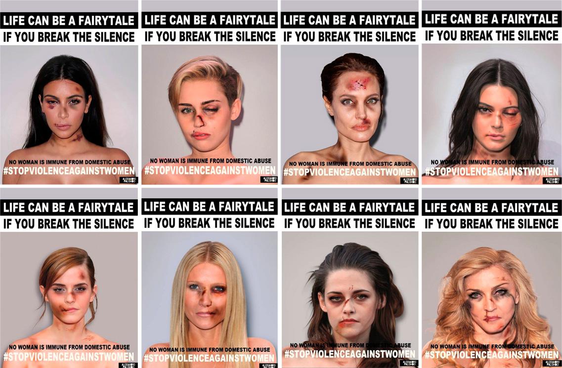 El artista italiano aleXsandro Palombo ha retocado los rostros de estrellas como Angelina Jolie, Kim Kardashian o Miley Cyrus para presentarlos desfiguradas por supuestos golpes recibidos y concienciar así contra la violencia machista. La campaña se llama Life Can Be A Fairytale, If You Break The Silence (La vida puede ser un cuento de hadas, si rompes el silencio) y ha sido presentada por el italiano en las redes sociales Twitter y Facebook con motivo del Día Internacional de la Eliminación de la Violencia contra la Mujer, que se celebra hoy.