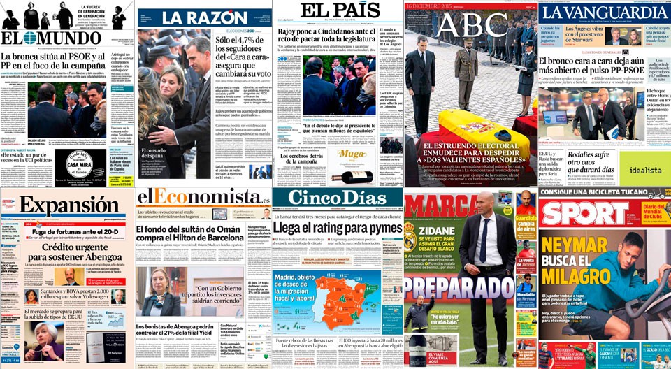 El bronco debate entre Mariano Rajoy y Pedro Sánchez, y las declaraciones posteriores de los candidatos y sus formaciones, sigue coleando en todas las portadas de la prensa. Destacado también el funeral por los dos policías asesinados en Kabul, incluso de ese acto muchos destacan el distante saludo entre Rajoy y Sánchez. La preferencia del presidente del Ejecutivo de un pacto para toda la legislatura, frente a pactos puntuales, también recurrente en las primeras.
