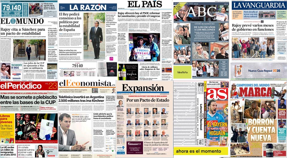 Siguen los movimientos electorales tras bambalinas de cara a una futura investidura. Por un lado, la reunión entre Rajoy y Sánchez de este miércoles centra la atención de los diarias a la vez que reflejan el acuerdo entre Mas y la CUP en Cataluña y la lluvia de millones de la Lotería de Navidad. En ABC, Ignacio Camacho desgrana la estrategia de Podemos, preparado para "el abordaje" una vez llegados al Congreso tras meses de contención antes de la campaña.