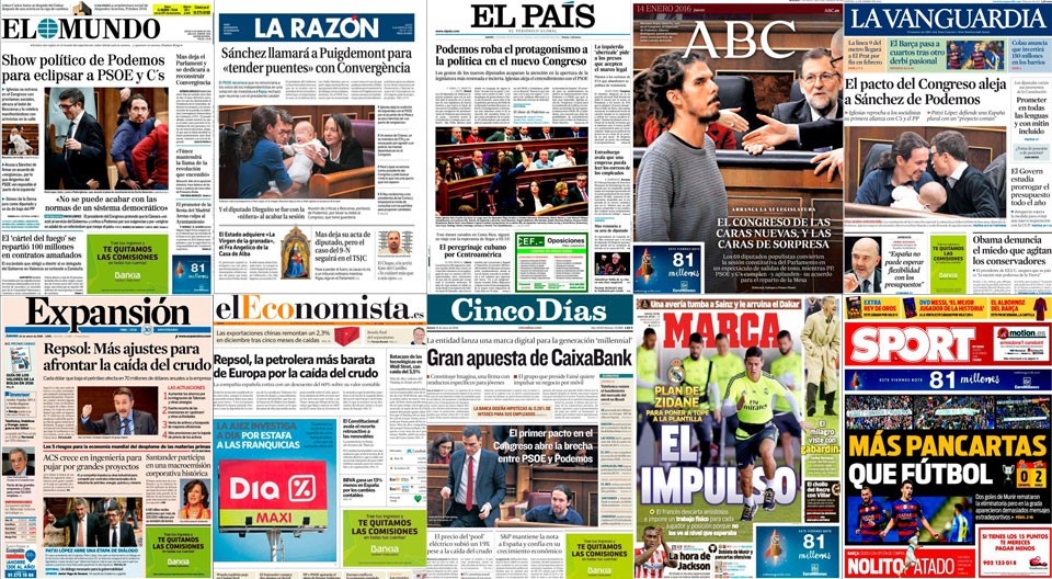 editorial "el show de Podemos" en el hemiciclo durante la sesión constitutiva de las Cortes y pide "recordar al nuevo partido que el Congreso no es un plató de televisión". La primera capa del análisis es positiva: la institución parlamentaria empieza a funcionar y "ampliamente renovada en su composición", respondiendo al cambio exigido por los ciudadanos en las urnas. Ese cambio, sin embargo, tiene una 'cara B' para el diario: "sobran las faltas de respeto al Parlamento". Las alusiones de Podemos a la necesidad de trabajar para cambiar la Constitución son, según El País, "perfectamente canalizables a partir del trabajo parlamentario, sin necesidad de convertir el pleno del Congreso en una suerte de teatro". El problema, sigue, es que "sus dirigentes están tan acostumbrados a manejarse ante las cámaras de televisión que han confundido el Congreso de los diputados en un plató". Además, Pablo Iglesias empieza "con mal tono", a pesar de que el resto de partidos "han respetado a Podemos con una representación en la Mesa proporcionada a su fuerza parlamentaria", y aleja el entendimiento con Sánchez para un eventual pacto de Gobierno.