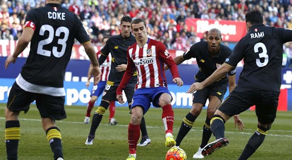 En tal tesitura de fútbol desfragmentado en guerra de guerrillas, donde nada resultaba descontextualizado salvo un episodio de exquisitez combinativa, cupo la tratativa de gol olímpico efectuada por Koke en el 26, el posterior lanzamiento desde larga distancia de Gabi, que quizá rememoró a más de uno la diana impecable asestada al Real Madrid hace un par de inviernos, o el rudo pelotazo que, testarazo en prolongación al segundo poste mediante, rozó la apertura del electrónico en el escorzo desatinado de Griezmann. Bajo el escenario de plomizo pragmatismo y virtuosa lectura e implementación de antídoto global atravesaba el duelo la media hora sin intervalos de dominio ni patrón que gobernara el relato, pero con cierta imposición de personalidad local. La incertidumbre a la que se habían abandonado ambos contrincantes parecería favorecer a la cosecha de sensaciones colchoneras. El Sevilla se manejaba con aparente placidez en el encierro perpetuo, que a estas alturas de minutaje yacía ya desprovisto de asideros de respiro, ni por alto ni en contragolpe.