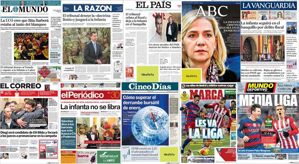 La confirmación de que la Infanta Cristina seguirá en el banquillo de los acusados del caso Nóos y las posiciones de partida de unos y otros ante el crucial Comité Federal socialista que se desarrolla a lo largo de la jornada ocupan las portadas de la prensa de este sábado, un día en el que el paso a la final del Europeo de la selección española de balonmano sólo queda recogido en la primera de El Mundo.