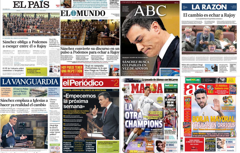 El Mundo lleva, por encima de su mancheta, una larga declaración de Vargas Llosa sobre la inquietud que le causa Podemos. La gran foto, para Sánchez durante el discurso de investidura: “Sánchez convierte su discurso en un pulso a Podemos para echara Rajoy”, titula el diario. Debajo puede verse a Otegi con el puño en alto, en lo que el diario interpreta que ya es campaña electoral: “Terrorismo es lo que hizo Fraga en Vitoria”.