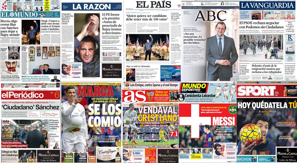 Los diarios analizan este domingo las estrategias de los partidos tras la fallida investidura de Pedro Sánchez: socialistas y naranjas, en bloque, como si fueran uno solo. Muy bonito, si no fuera porque Ciudadanos no se cierra las puertas a un tercero, siempre y cuando no venga dirigido por Rajoy. Mientras, el presidente del Gobierno en funciones sigue empeñado en un 'menage a trois' y Podemos descansa hoy de titulares. Además, la mayoría de los diarios coincide en destacar como imagen de la jornada del sábado a un Otegui exultante, anunciando a bombo y platillo el inicio del proceso independentista vasco.