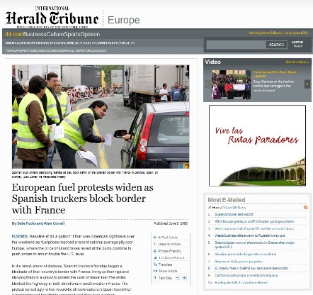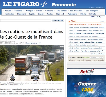 En una amplia crónica, en su versión on line el francés "Le Figaro" ha destacado aquello que afecta al Hexágono. Los camioneros franceses se han unido a los españoles para bloquear los pasos fronterizos de La Junquera (Gerona) e Irún (Guipúzcoa). Informa el diario que "la cólera de los transportistas contra la subida del gasoil ha afectado a todo el Sudoeste de Francia".