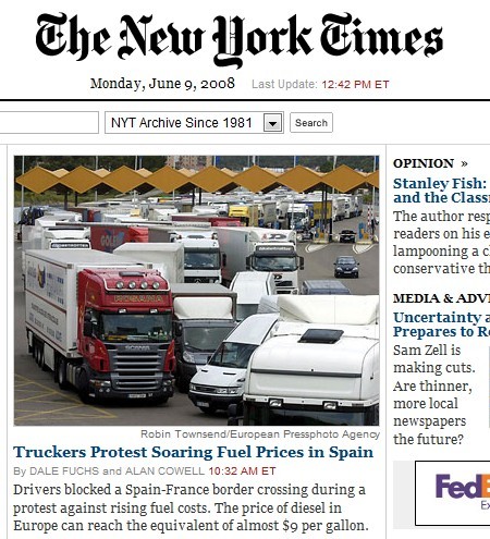 "Lástima, pobres europeos". De esta forma se compadecen los periodistas del "Times" de Nueva York ante la espectacular subida del precio de los carburantes, que ha llevado a miles de camioneros españoles a bloquear las principales carreteras del país y a cerrar la frontera con Francia. El artículo, que no oculta su sorpresa ante el precio del litro de gasolina, señala que en Europa "los impuestos recaudados y el propio precio del petróleo (138 dólares el barril)" se combinan para elevar el precio casi al doble de su valor en Estados Unidos.