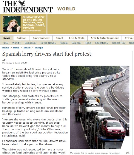 En unas declaraciones de Jaime Díaz, presidente de la Confederación Nacional Española de Transporte por Carretera, recogidas por el diario especializado en cuestiones económicas, "nadie gana suficiente dinero para comer. Ni los camioneros ni los pescadores. Nadie. Alguien debe encontrar una solución". El diario hace referencia al bloqueo de los centros de distribución por parte de los huelguistas, que reclaman una tarifa mínima de transporte para hacer frente a un aumento del 35 por ciento de sus gastos en combustible en los últimos 12 meses.