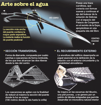 El Ebro cobra protagonismoSin embargo, es el Ebro el que se ha convertido, gracias a la Expo, en la “calla Mayor” de Zaragoza. Y no sólo ha salido beneficiado el Ebro, la propia ciudad cuenta con 18 nuevos puentes, pasarelas sobre los cuatro cauces, nuevos accesos de carreteras, la primera línea ferroviaria y una nueva terminal aérea.