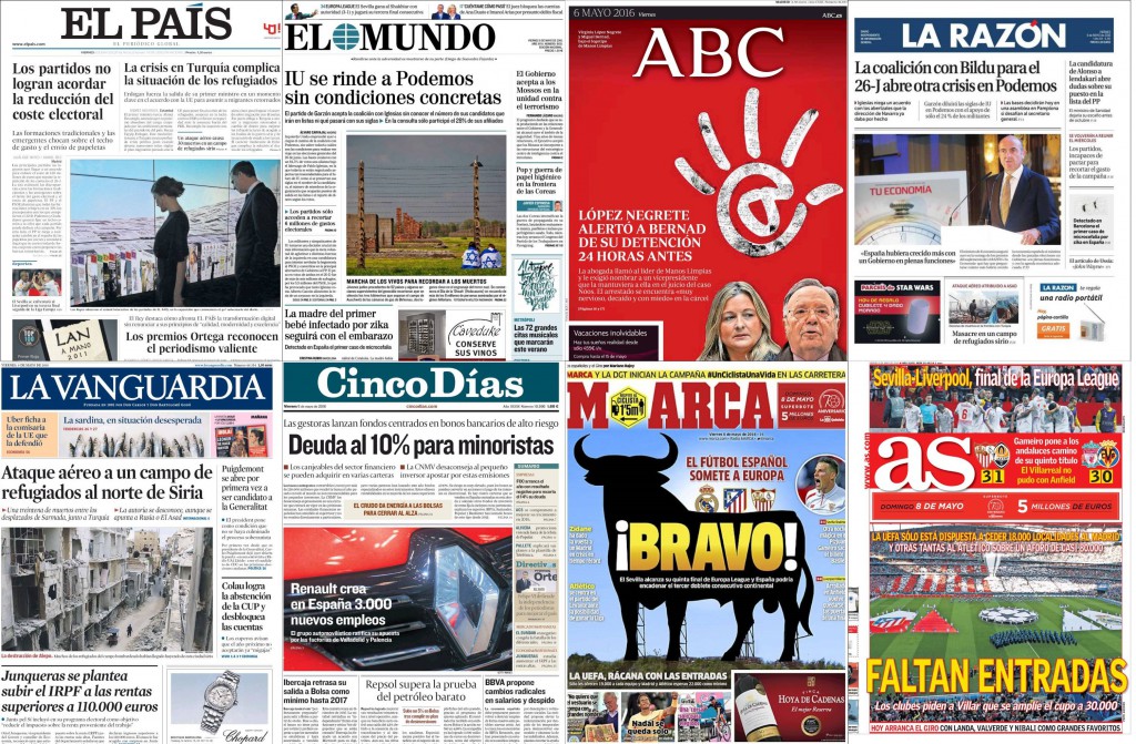 El País lleva a portada que “Los partidos no logran acordar la reducción del coste electoral”, ya que las formaciones tradicionales y las emergentes chocan sobre el techo de gasto y el envío de papeletas. En la foto, los Reyes observan un stand de la exposición del diario, que cumple cuarenta años. En terreno internacional, “La crisis en Turquía complica la situación de los refugiados”.