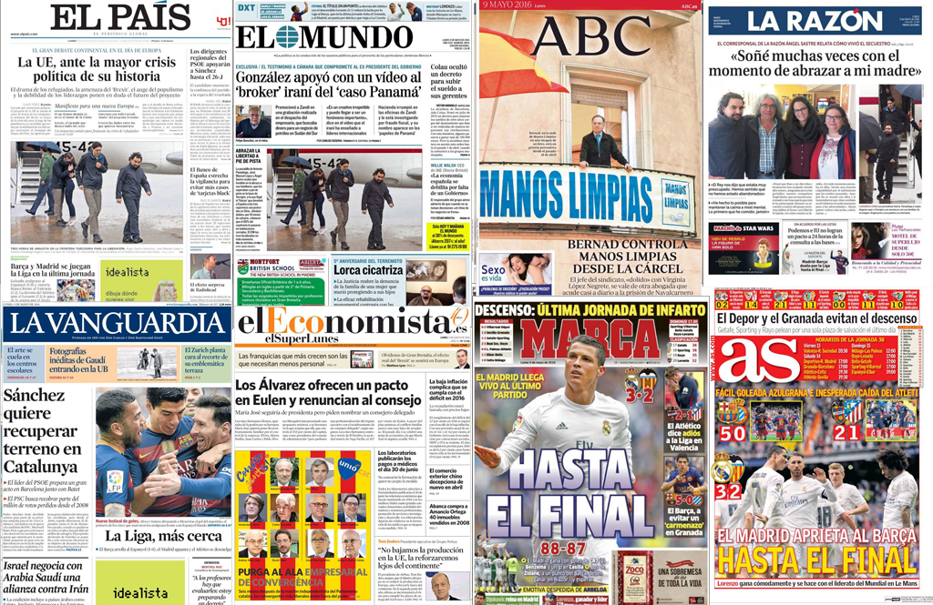 El Mundo empieza la semana con una exclusiva: "González apoyó con un vídeo al 'broker' iraní del 'caso Panamá". De esta forma, se hace eco del "testimonio a cámara que compromete al ex presidente del Gobierno", Felipe González, que promocionó a Zandi en una grabación realizada en el despacho del empresario, que buscaba dinero para un negocio de petróleo en Sudán del Sur. "Es un creativo irrepetible y puede llegar a ser un fenómeno importante", dice en el vídeo que el iraní ha enseñado a líderes internacionales. La gran foto de portada es para los reporteros españoles que han permanecido secuestrados en Siria casi diez meses: "Abrazar la libertad a pie de pista", es el titular de su llegada a España. De política, cuenta este periódico que "Colau ocultó un decreto para subir el sueldo a sus gerentes". "Lorca cicatriza", en el quinto aniversario del terremoto, al que este diario dedica un amplio reportaje.