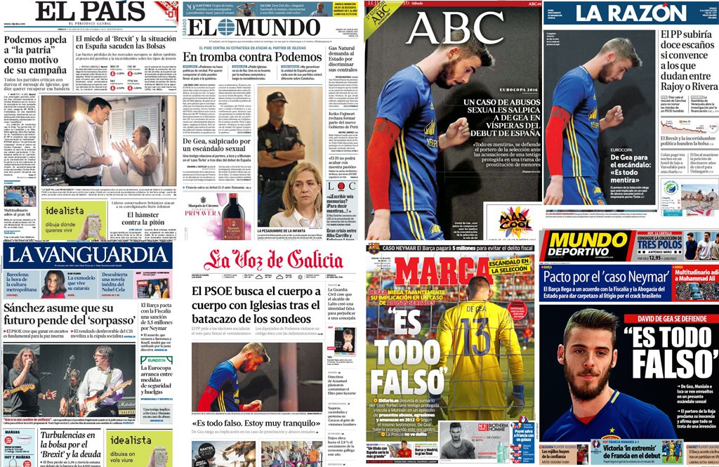“Un caso de abusos sexuales salpica a De Gea en vísperas del debut de España” en la Eurocopa, explica ABC: “’Todo es mentira’, se defiende el portero de la selección ante las acusaciones de una testigo protegida en una trama de prostitución de menores”, añade el diario.