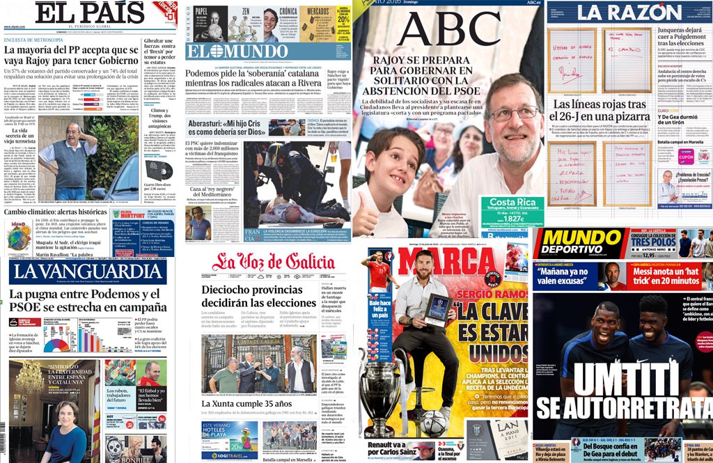 Variedad de temas en las portadas de los principales diarios en papel de este domingo. No hay unanimidad, pero sí un asunto que destaca: el calendario avanza hacia el 26J y los candidatos se afanan en acercarse a la gente, movilizar al electorado y dar argumentos a los indecisos para que elijan la papeleta de sus partidos.