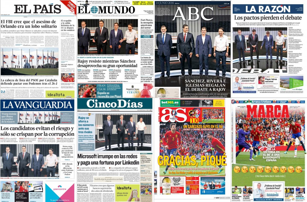 “Corrupción, empleo y recortes centran un debate sin ganador”, según El País. La segunda noticia destacada mira a Estados Unidos: “El FBI cree que el asesino de Orlando era un lobo solitario que se radicalizó por Internet”. Otro titular con respecto a esta información: “El ISIS utiliza el ataque pese a la falta de vínculos con el agresor”. En la columna de salida: “El respaldo a la salida británica de la UE se dispara en los sondeos”; “Microsoft adquiere LinkedIn”; “España vence en la recta final con un gol de Piqué”; y “¿Por qué no hay mujeres al frente de grandes museos?”.