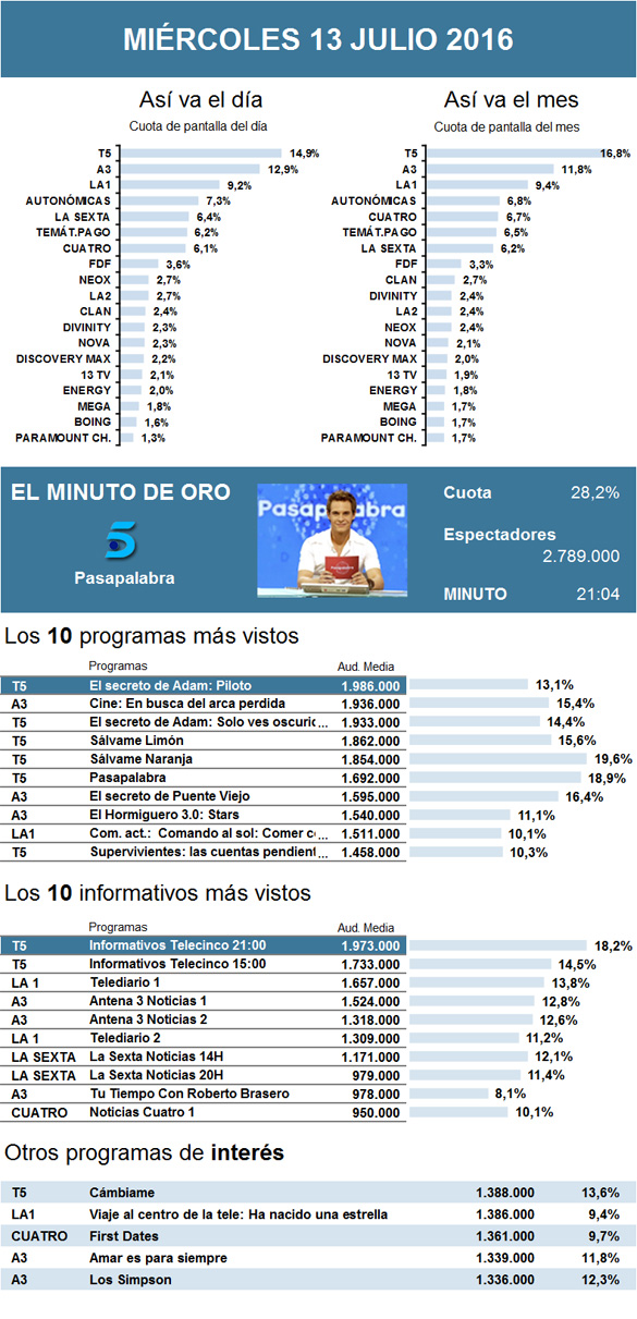 Este miércoles, Telecinco volvió a hacerse con el completo liderazgo del día pese a no contar ya con la Eurocopa. Se coronó como minuto de oro Pasapalabra con una cuota de pantalla del 28,2 por ciento y 2,8 millones de espectadores a las 21:04.Sin embargo, lo más visto de la jornada fue el estreno en la cadena de El secreto de Adam, que sedujo a un 13,1 por ciento de audiencia y a cerca de 2 millones de curiosos. Aún con dichas cifras, le pisó los talones película de Antena 3, En busca del arca perdida, pues logró reunir a un 15,4 por ciento del 'share' y a 1,9 millones de interesados. Le siguió La 1 con Comando actualidad: Comando al sol, que cayó en relación con la semana pasada hasta una cuota del 10,1 por ciento y a 1,5 millones de incondicionales. También descendió su programaposterior, la segunda entrega de Trabajo temporal, debido a un 8,7 por ciento de audiencia y un millón de seguidores. Por detrás volvieron a quedar muy reñidas Cuatro y La Sexta. Tanto Esclavas: qué hay detrás de la prostitución, de la primera, como El mentalista en la segunda, cayeron por debajo del 5 por ciento del 'share' y rondaron el millón de adeptos, un cuarto de millón menos que el miércoles pasado. El cine de La 2, con Tocata y fuga de Lolita, recuperó levemente el interés perdido en películas anteriores gracias a una cuota del 3,3 por ciento y a casi medio millón de espectadores.