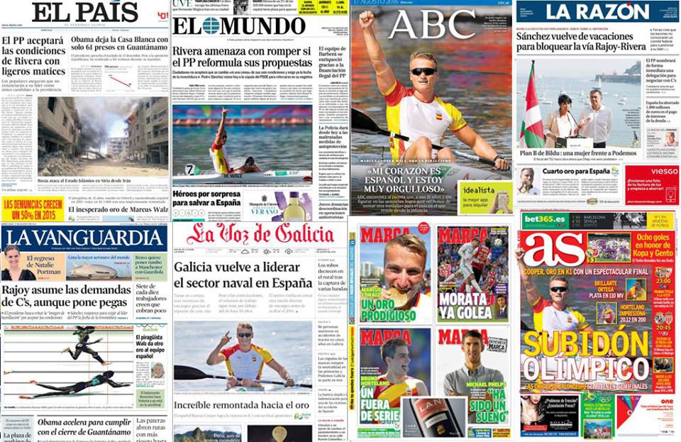 “El PP aceptará las condiciones de Rivera con ligeros matices”, adelanta El País, cuya segunda noticia viene del ámbito internacional: “Obama deja la Casa Blanca con solo 61 presos en Guantánamo”. También del exterior llega la fotografía principal: “Rusia ataca al Estado Islámico en Siria desde Irán”. Y de los Juegos, “El inesperado oro de Marcus Walz”.