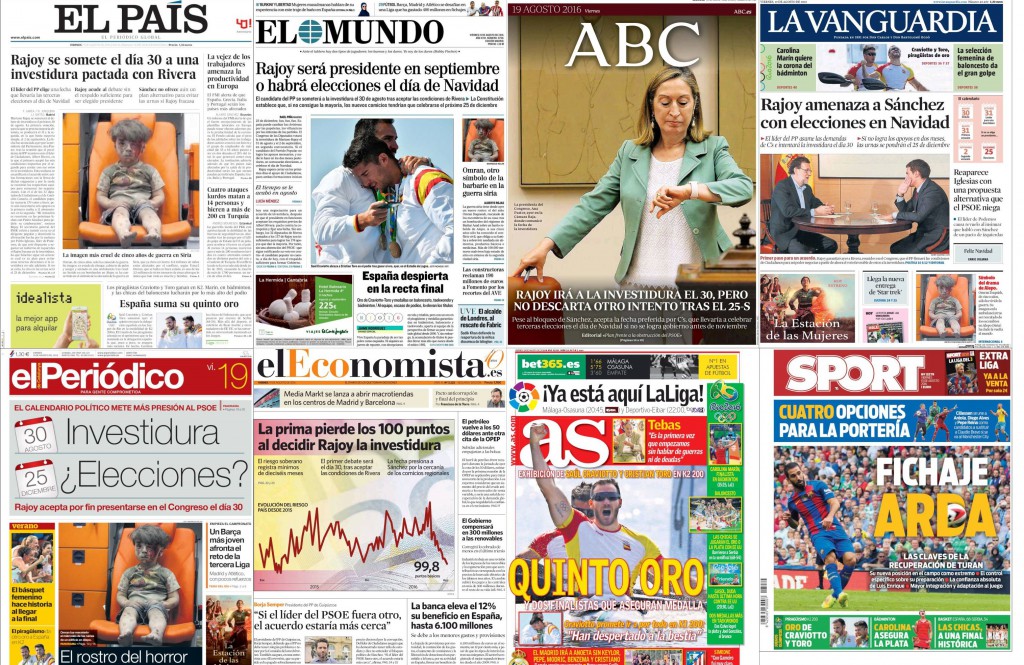 El Mundo, a todo el ancho de página: “Rajoy será presidente en septiembre o habrá elecciones el día de Navidad”. Asegura que el candidato del PP se someterá a la investidura el 30 agosto tras aceptar las condiciones de Rivera, mientras que la Constitución establece que, si no consigue la mayoría, los nuevos comicios tendrían que celebrarse el próximo 25 de diciembre. En la foto, Saúl Craviotto abraza a Cristian Toro tras ganar el oro: “España despierta en la recta final”, dice el diario sobre los Juegos de Río. Además, la foto de Omran, un niño de cinco años aturdido y ensangrentado tras un bombardeo: “Otro símbolo de la barbarie en la guerra siria”.