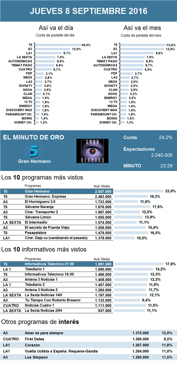 A Telecinco le sigue funcionando la gallina de los huevos de oro. Este jueves daba comienzo la 17 edición del reality más longevo de la televisión española: Gran Hermano, y a la vista de los datos de audiencia, los telespectadores sienten interés por la nueva entrega: más de 2,5 millones de seguidores -que subieron hasta 3,5 en el minuto de oro- y un 24 por ciento del 'share' lo alzaron como lo más visto de la noche. Su 'GH Exprés' ya calentó motores en la franja anterior al prime time y se coloca en segundo lugar, aventajando por mucho al líder de los dos últimos días, El Hormiguero.
