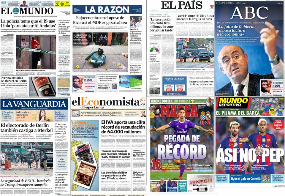 El país, Alberto Núñez Feijóo asegura: "La corrupción nos costó tres millones de votos por actuar tarde". De cara al 25S publica también un sondeo de Metroscopia sobre los resultados electorales en País Vasco, que renueva, según la encuesta, "el apoyo a Urkullu y castiga al PSE". También sobre elecciones, pero en Europa, "Merkel sufre una nueva debacle". Señala también el diario que "la crisis entre EEUU y Rusia amenaza la tregua en Siria", donde "la muerte de más de 60 soldados de El Asad en un bombardeo estadounidense dispara las acusaciones entre ambas potencias". La foto del día es para el escenario que dejó la explosión del sábado en Chelsea. "Una bomba devuelve el miedo a Nueva York", titula al pie. Por útimo, sobre el crimen de Guadalajara: "Cuatro asesinatos con la firma de sicarios".