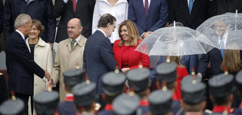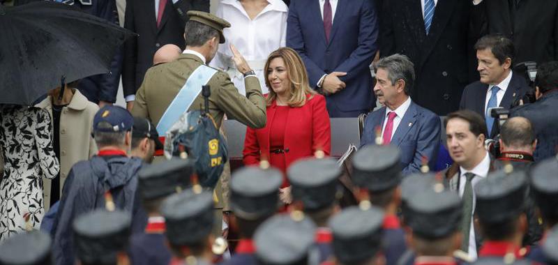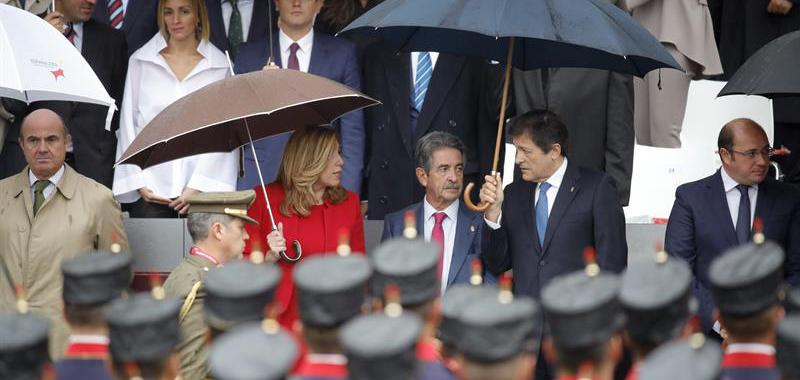 La presidenta de Andalucía Susana Díaz, conversa con el presidente de Cantabria, Miguel Ángel Revilla (c), y el presidente de Asturias y de la gestora del PSOE, Javier Fernández (d), momentos antes del acto central del Día de la Fiesta Nacional. A su lado, el ministro de Economía, Luis de Guindos y detrás, el líder de Ciudadanos, Albert Rivera. EFE