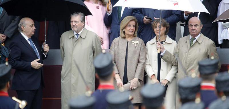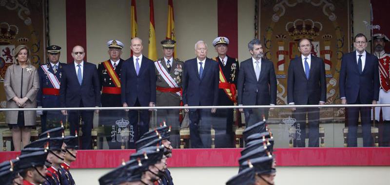 Mariano Rajoy (d) sigue desde la tribuna el acto central del Día de la Fiesta Nacional. A su lado, los ministros Fátima Báñez, Jorge Fernández Díaz, José Manuel García-Margallo, el presidente del Tribunal Supremo, Carlos Lesmes y el presidente del Senado, Pío García Escudero (i a 2d). EFE