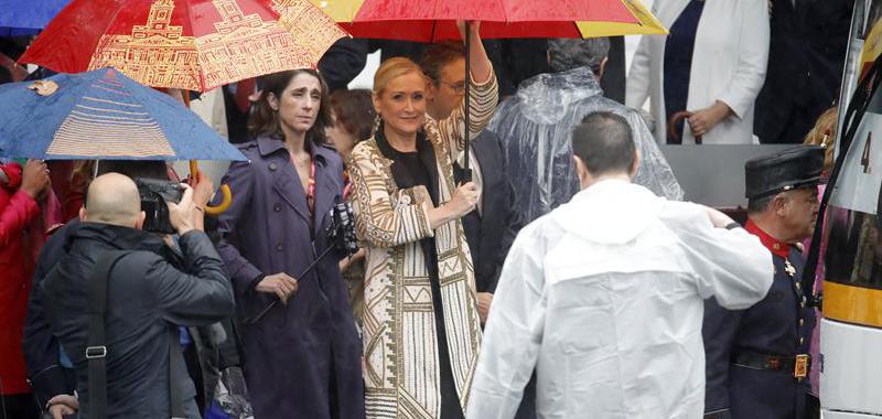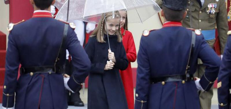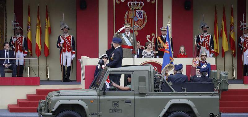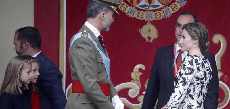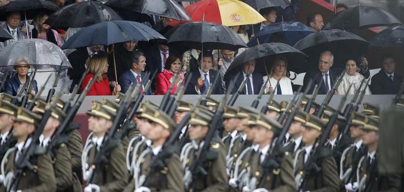 La lluvia ha obligado a reducir a la mitad la exhibición aérea prevista y ha deslucido el desfile de la Fiesta Nacional, el primero que se celebra con un Gobierno en funciones, presidido por los Reyes, acompañados por sus hijas, la princesa Leonor y la infanta Sofía. El presidente en funciones, Mariano Rajoy, ha sido prudente con respecto a su investidura: "Lo mejor que puedo hacer es estar callado", ha dicho, mientras que el PSOE ha asegurado que la investidura puede darse el día 29 de este mes.