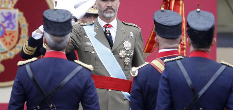 El Rey Felipe saluda a su llegada al acto central del Día de la Fiesta Nacional, en el que se rinde homenaje a la Bandera y a los que dieron su vida por España, y que cuenta con desfiles aéreo y terrestre. EFE