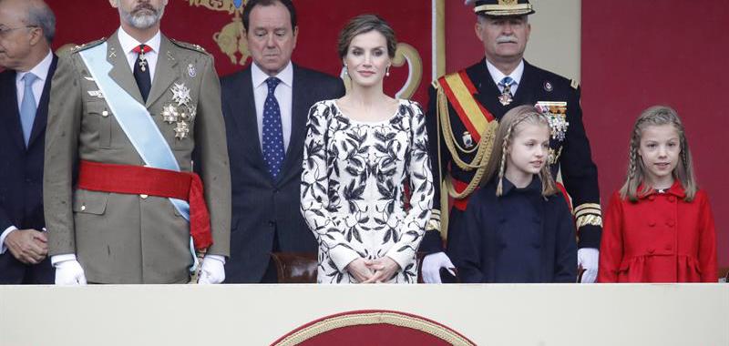 Los Reyes, junto a sus hijas, la Princesa de Asturias y la infanta Sofía, presiden el desfile militar, en el acto central del Día de la Fiesta Nacional. EFE